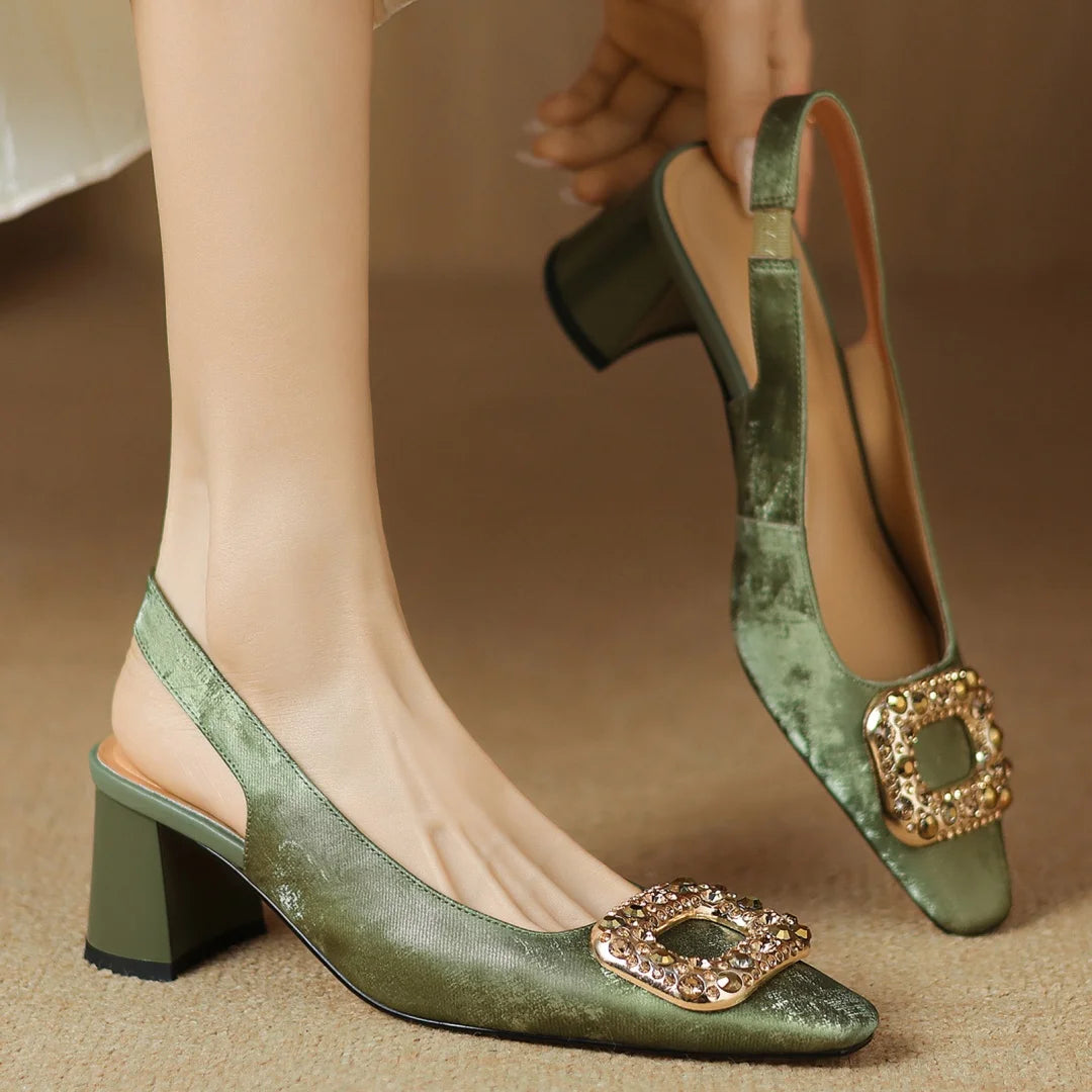 Patterned silk meets modern shine in these genuine leather slingbacks, finished with a crystal-studded buckle that catches the light. A square toe and sculpted heel balance vintage charm with bold sophistication.