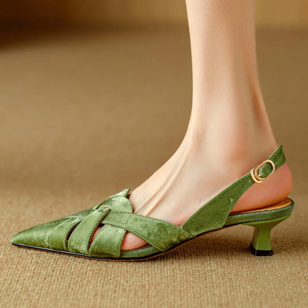 This pair makes its case the moment you slip them on—suede-finished leather that catches the light, a pointed silhouette, and a slingback strap that holds with ease.